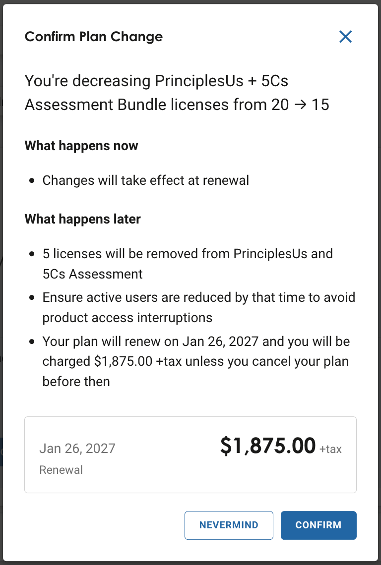 - Once you select Review Changes, you will be taken to a confirmation page to review your plan update. To apply the changes, select Purchase. If you do not want to proceed, select 'Nevermind' to cancel the update.