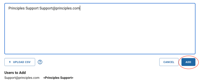 - You can enter or paste users into this field directly. Alternatively, you can upload a CSV file by clicking the Upload CSV button or dropping it into the field below.