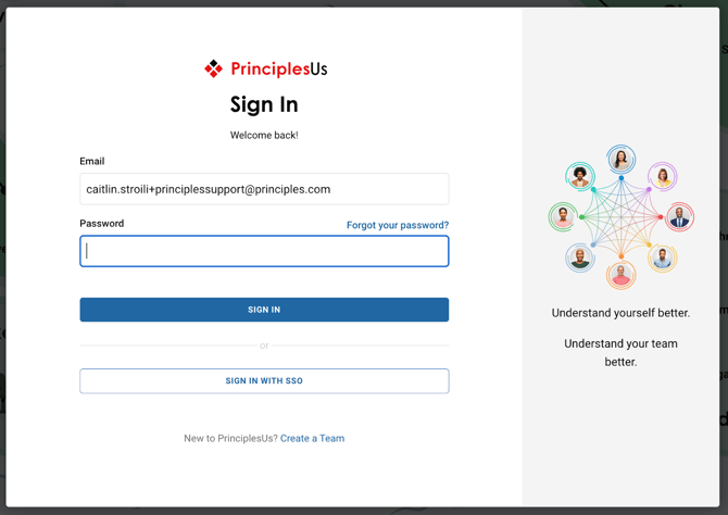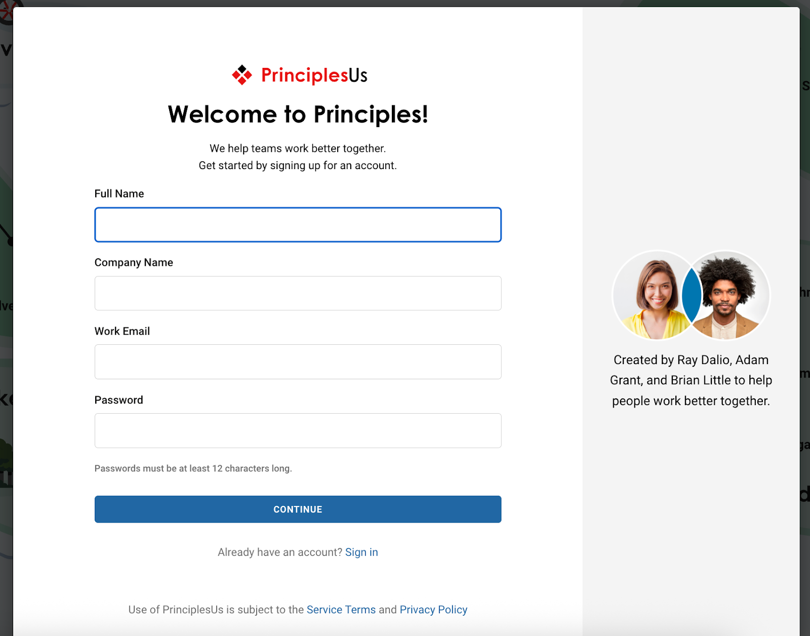 https://my.principles.com/app/auth/signup. Here you will be prompted to enter your Full Name, Company Name, Work Email, and a Password of your choosing.