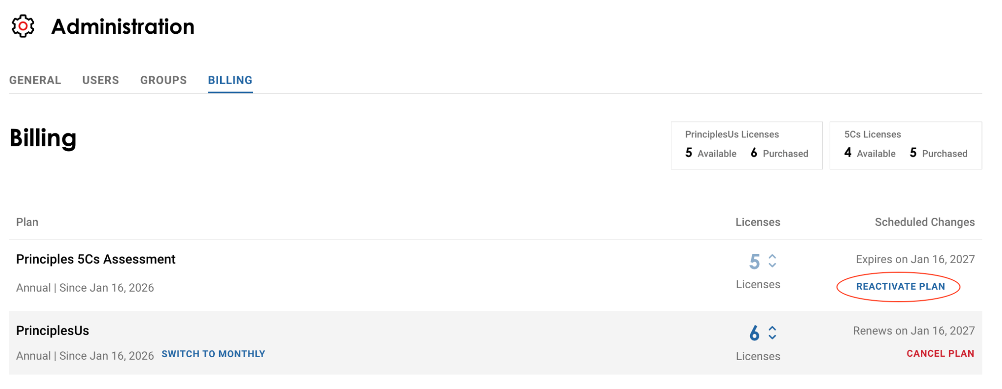 Should you want to cancel any of your Principles Tools plans, navigate to the Administration section and click on the Billing tab.