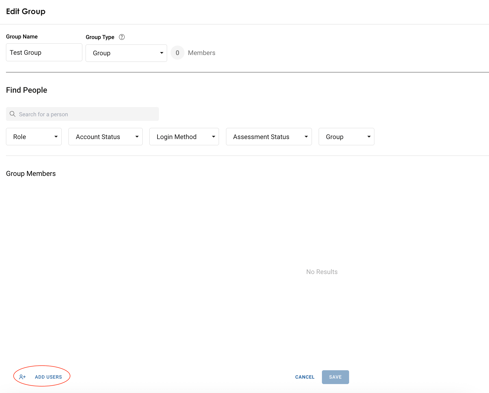 - Once in the group, select the ‘add users’ button at the bottom left of the group pop-up